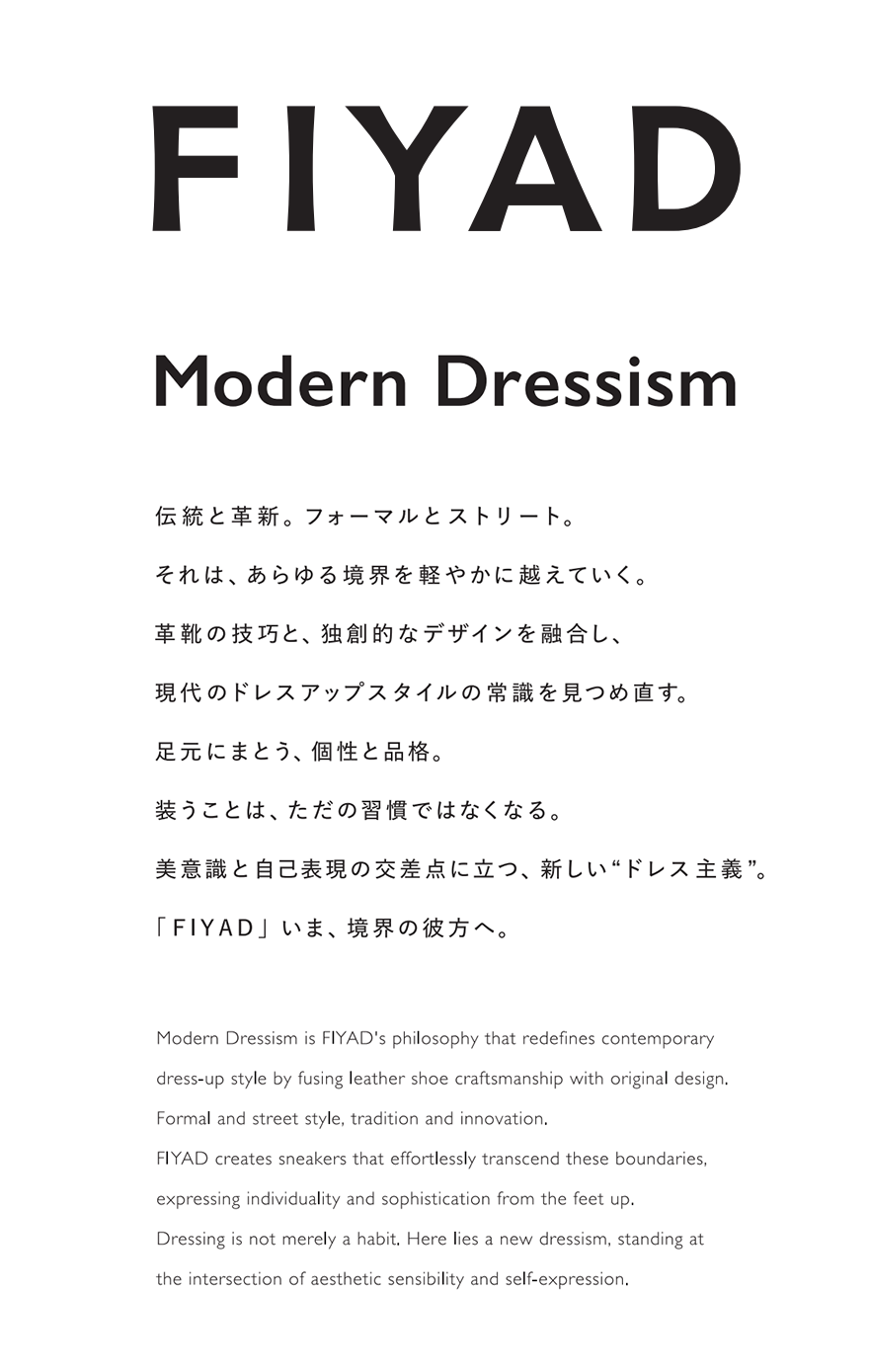 TOSMAX株式会社が立ち上げる新スニーカーブランド「FIYAD」のブランド開発を担当。ゼロからの立ち上げにおいて、市場環境やターゲットの価値観を再定義しながら、ブランド戦略を設計。フォーマルとストリートを横断し、既存のスタイルや価値観に新たな解釈を与える「Modern Dressism」をブランドコンセプトとして、ネーミング、ロゴ、フィロソフィーを開発。さらに、ブランドが発信するメッセージや佇まい、トーン&マナーを設計し、ブランドの世界観を構築。思想とプロダクトが有機的に結びつくブランド体験を実現しました。FIYADの存在意義と独自性を明確化し、持続的に価値を発信し続けるブランド基盤を開発しました。